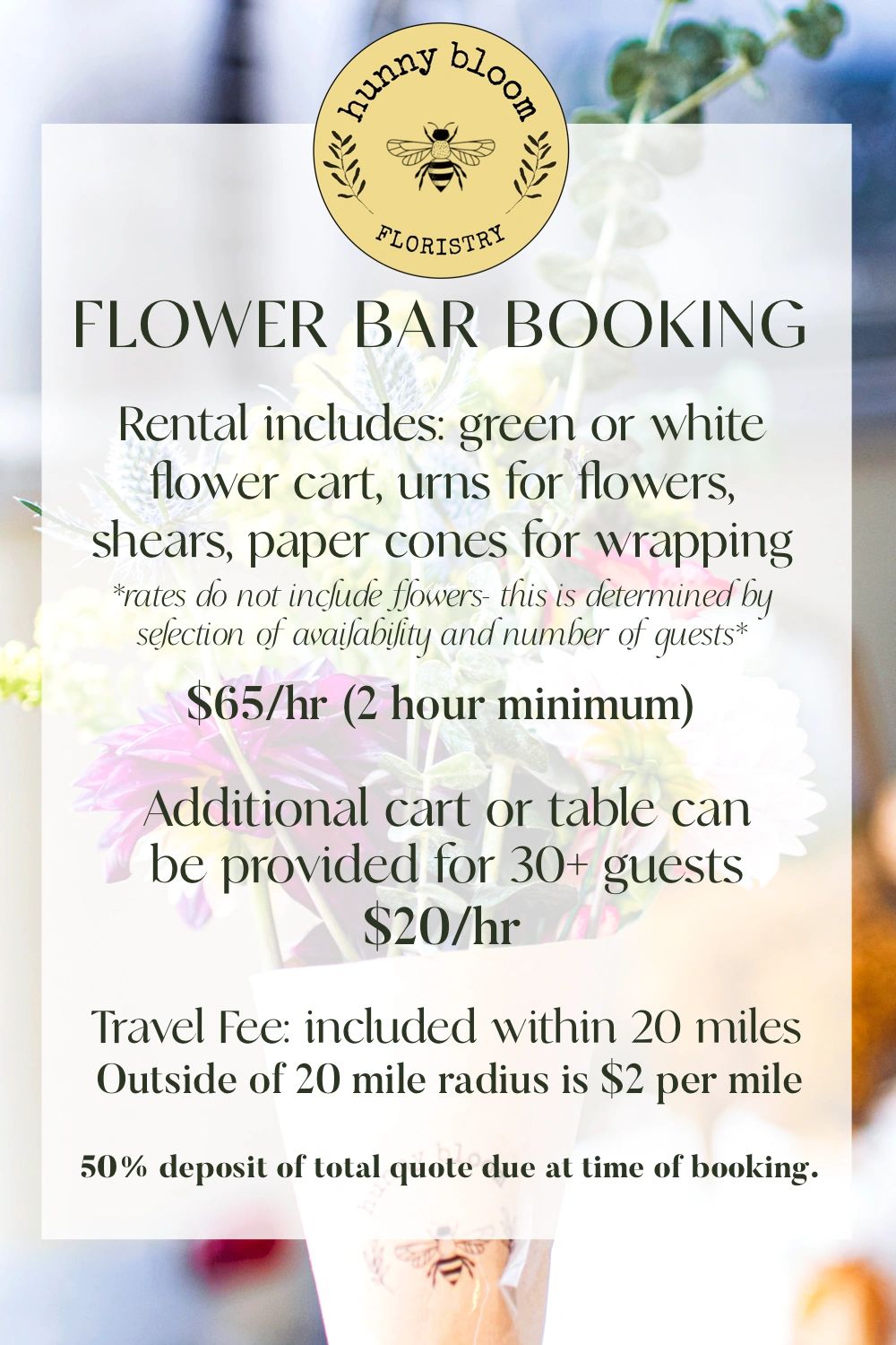 50% deposit due at time of booking and will be applied to the balance of total booking cost